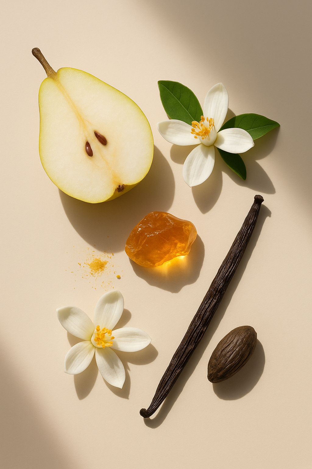 Een sprankelende mix van neroli, peer en amber, die zich ontwikkelt tot een zachte bloemige hartnoot met muskus en vanille.